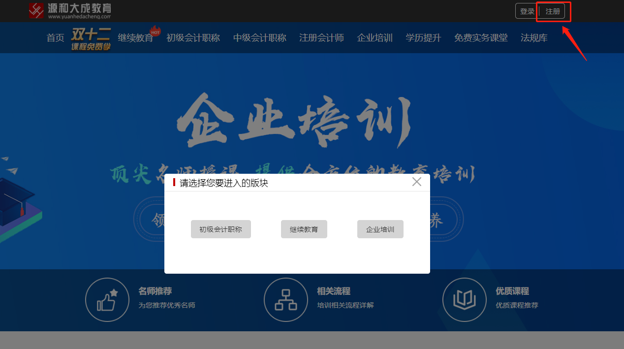 2、注册成功后需要去登录,在页面右上角点击“登录”按钮,选择需要进入的版块进行购买课程,如图3、4所示: